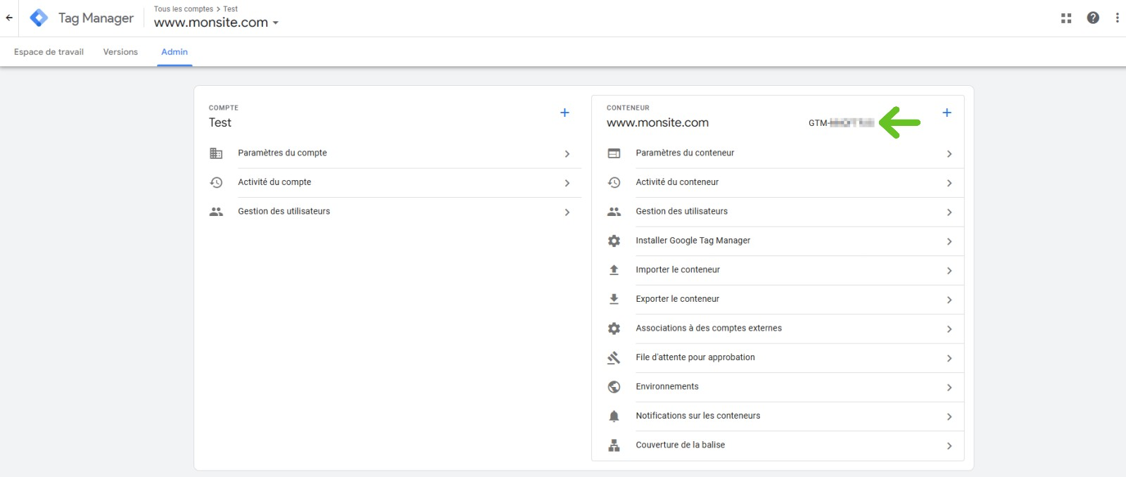 Connectez-vous à votre compte Google Tag Manager, puis dans le menu de gauche, cliquez sur Admin. Vous verrez votre identifiant à votre droite.